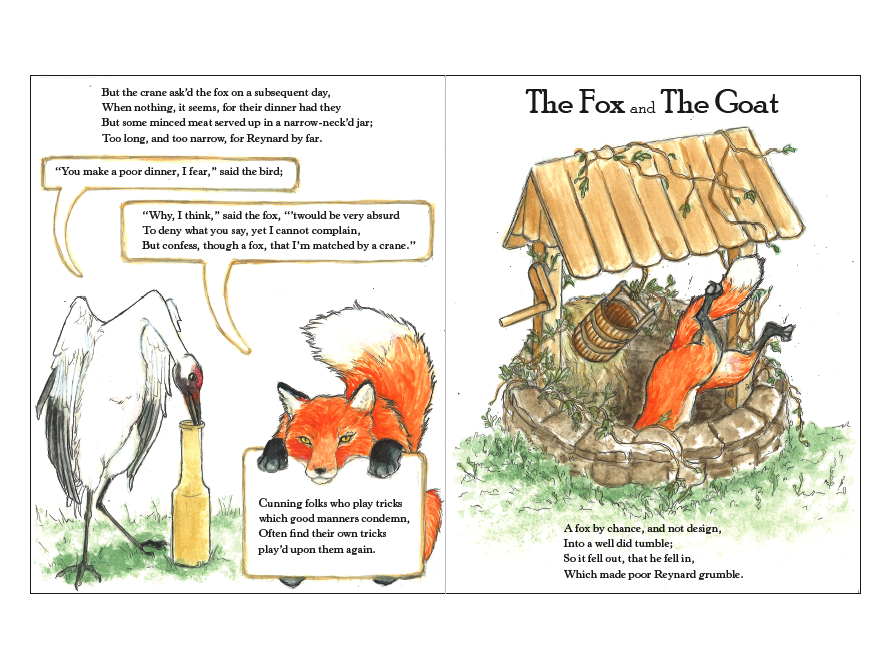 Hey all! Just a recap, my senior project is of a fifteen page illustrated children's book on four fables (based on the fox character) of the out of copyright text "Aesop in Rhyme." The dimensions of the book is 10" high x 8" wide (so 10" high x 16" wide when open as a full spread).